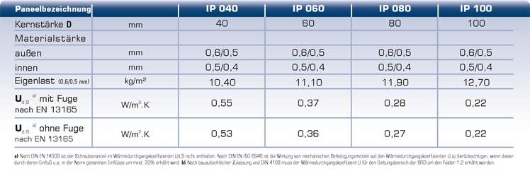von 40, 60, 80 und 100 mm (weitere Kernstärken 120 – 200 mm)