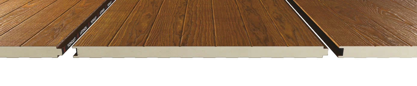 Isopar® Plus Lambris is a sandwich panel that can be made with PUR polyurethane or PIR polyisocyanurate, offering very high thermal performance and fire reaction properties. It is an ideal product for facade cladding when you want to enhance the building with a wood finish. In fact, its design and coloring are reminiscent of paneling made with wooden planks.