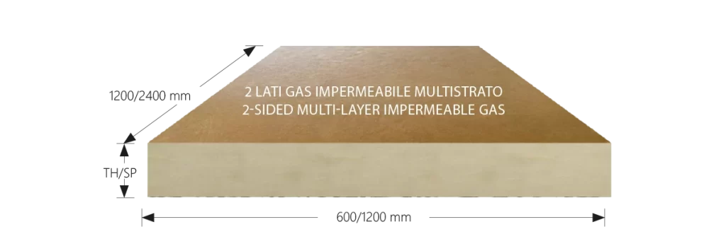 Sandwich panel consisting of a PIR foam insulation component without the use of CFCs or HCFCs compliant with the CAM Minimum Environmental Criteria, coated on both sides with a multi-layer impermeable gas coating. Due to its light weight and great rigidity, it is easy to move and position during installation.