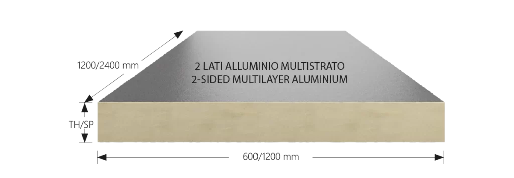 Sandwich panel consisting of a CFC- or HCFC-free expanded PIR foam insulation component compliant with the CAM Minimum Environmental Criteria, clad on both sides with a multilayer aluminium coating.