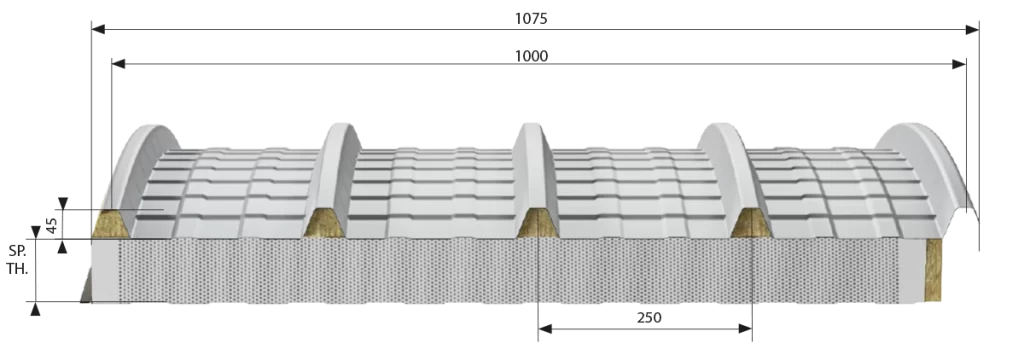 Il pannello sandwich ISOCINQUEFLEX® FIRE raggio fisso di Lattonedil rappresenta la soluzione ideale per coperture aventi strutture prefabbricate a volta in ferro o in cemento. Il progettista può personalizzare in base alle proprie esigenze sia il raggio di curvatura che le prestazioni termiche.