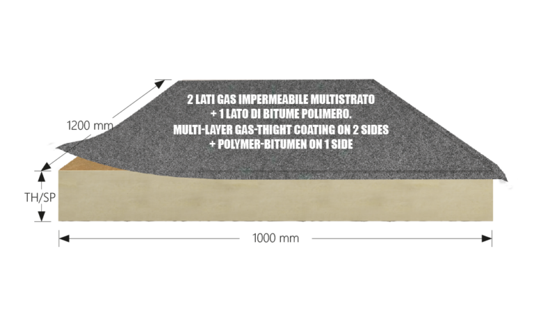 ISOTT Gas+bitume polimero è un pannello sandwich costituito da un componente isolante in schiuma PIR espansa senza l’impiego di CFC o HCFC, rivestito su entrambi i lati con un rivestimento gas impermeabile multistrato e accoppiato su una superficie ad una membrana bitume polimero. I pannelli hanno due cimose di sormonto, una sul lato corto e una sul lato lungo.