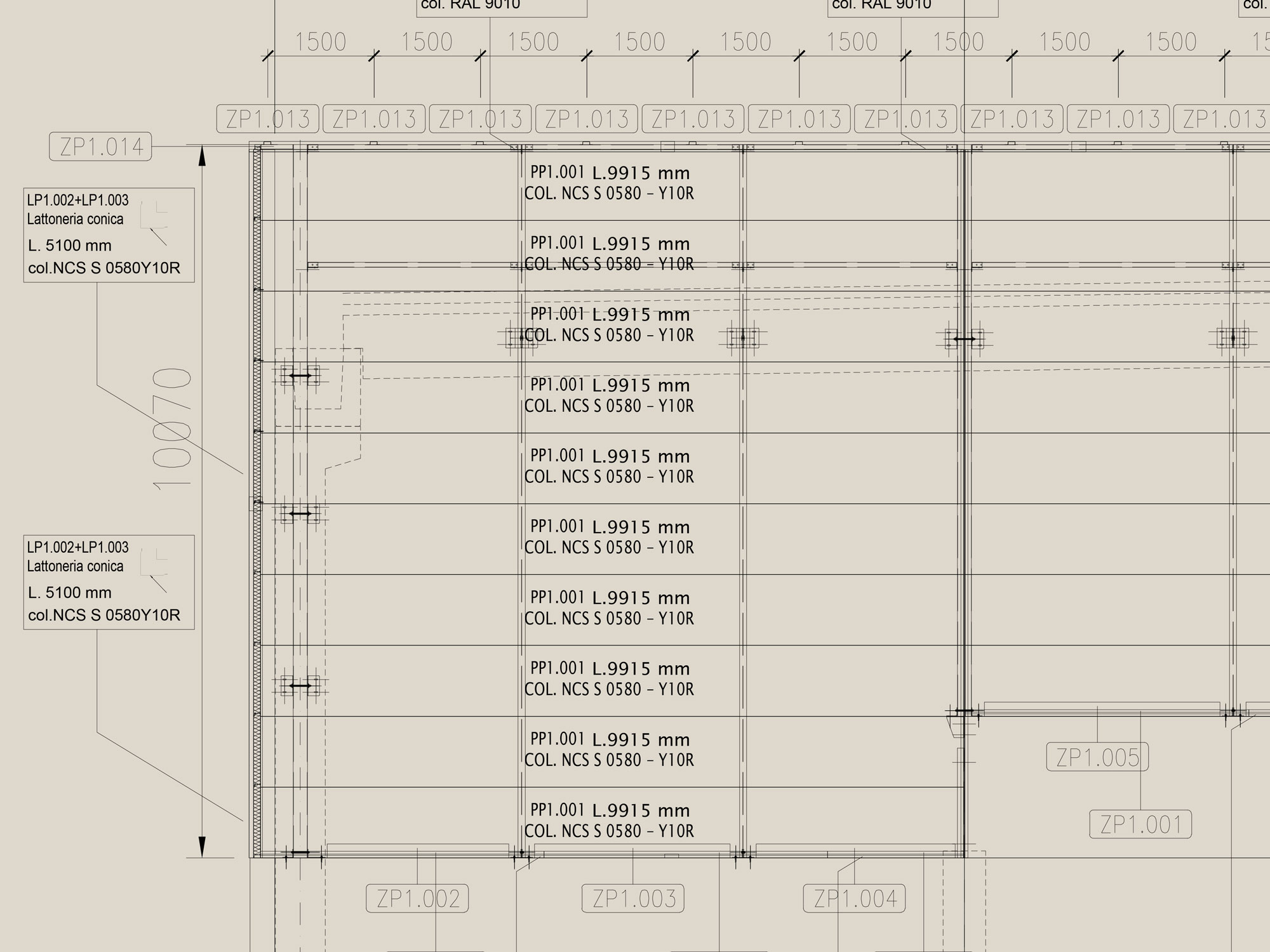 – Lamiera esterna con finitura diamantata in acciaio S250GD conforme alla norma EN10346:2009, zincato con procedimento sendzimir, avente protezione di zinco non inferiore a 100 gr/mq, preverniciato con ciclo poliestere colore Postyellow NCS S 0580 – Y10R. sp. 6/10.