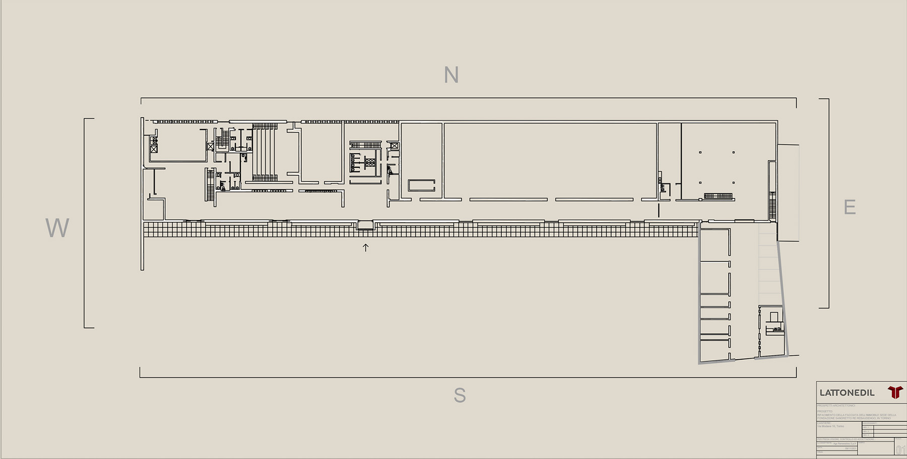 Significativa per il progetto è una configurazione volumetrica simile a quella di una tipica fabbrica o officina del nord Italia: un lungo capannone, alto 9 m, che si estende orizzontalmente su un livello per 130 m.